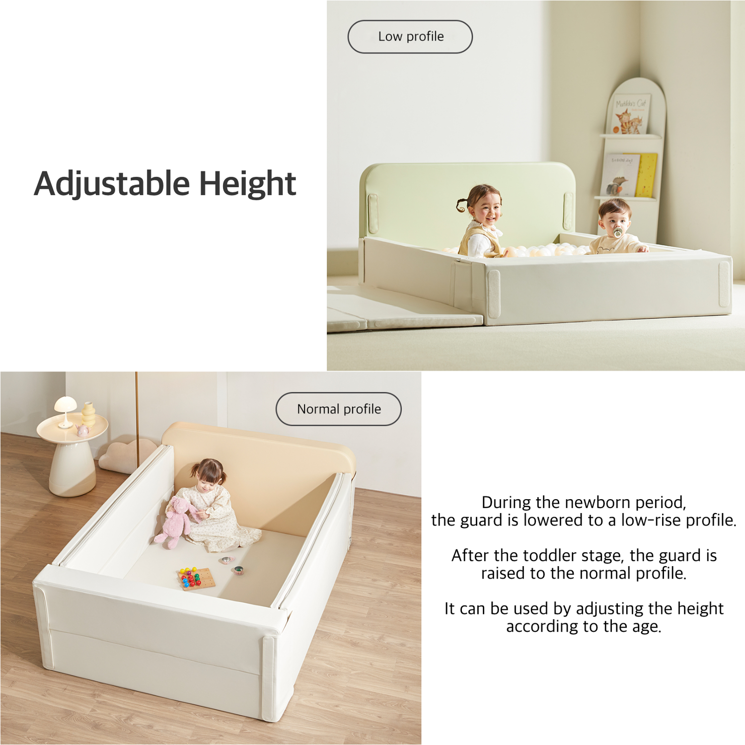 ✅ ADJUSTABLE HEIGHT - During the newborn stage, the guard can be lowered to a lower profile. After the toddler stage, the guard can be raised to the normal profile. It can be used by adjusting the height according to the age.