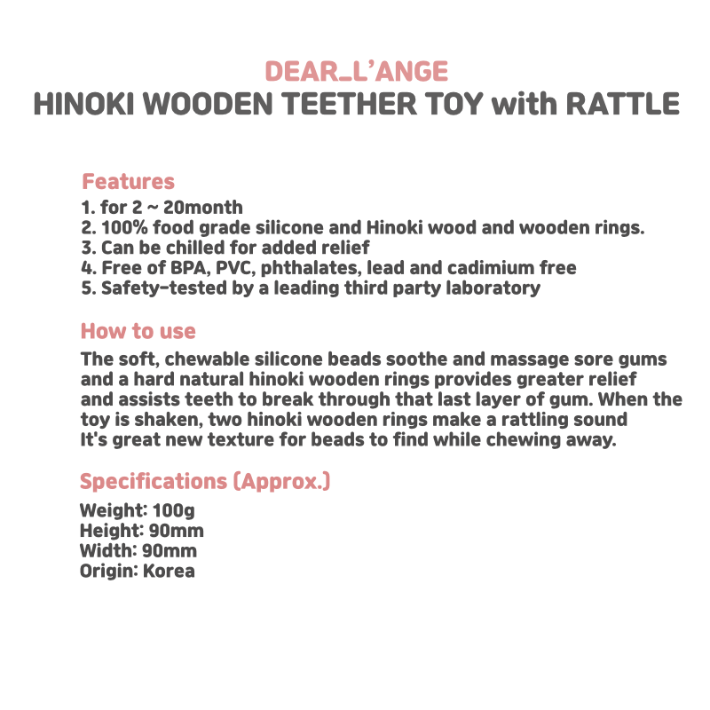 The soft, chewable silicone beads soothe and massages sore gums and a hard natural hinoki wooden ring provides greater relief and assists teeth to break through